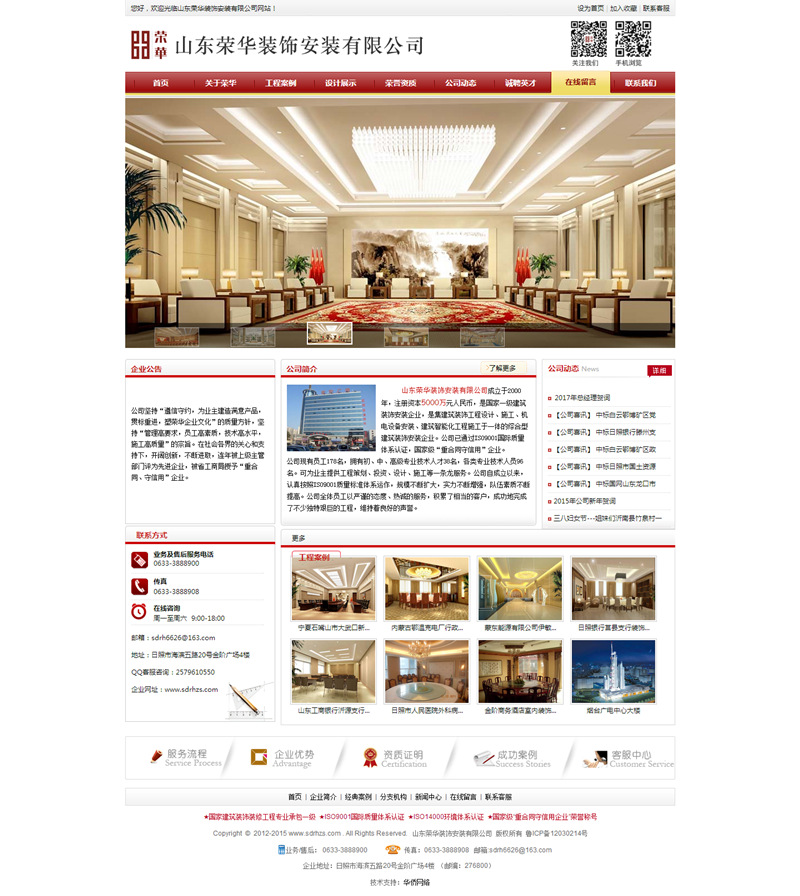 公司自成立以來,認(rèn)真按照ISO9001質(zhì)量標(biāo)準(zhǔn)體系運(yùn)作,規(guī)模不斷擴(kuò)大,實(shí)力不斷增強(qiáng),隊(duì)伍素質(zhì)不斷提高。公司全體員工以嚴(yán)謹(jǐn)?shù)膽B(tài)度、熱誠的服務(wù),積累了相當(dāng)?shù)目蛻,成功的完成了很多艱巨的建筑安裝工程,維持著良好的聲譽(yù)。公司尊重知識(shí),尊重人才,開發(fā)技術(shù)力量,依靠科技進(jìn)步,創(chuàng)造自己的企業(yè)文化,激發(fā)員工的向心力和凝聚力。建立起了完善的集設(shè)計(jì)、施工、銷售、服務(wù)等為一體的時(shí)常經(jīng)營(yíng)體系。同時(shí),不斷加強(qiáng)企業(yè)內(nèi)部管理,實(shí)現(xiàn)了公司電腦網(wǎng)絡(luò)化管理。塑造品牌,重視信譽(yù),嚴(yán)把質(zhì)量關(guān),形成了一整套完善的施工管理和質(zhì)量保證體系,使榮華形成了一支凝聚力強(qiáng),能夠立足山東,面向全國(guó),高瞻遠(yuǎn)矚,積極向上的集體。“做精品工程,創(chuàng)榮華品牌”的經(jīng)營(yíng)理念使榮華的事業(yè)蒸蒸日上.我公司先后在省內(nèi)外承接了金階商務(wù)酒店室內(nèi)裝修工程、山東淄博市工商銀行沂源、南定、洪溝、臨淄、桓臺(tái)、胡田、王舍、唐索路等分理處室內(nèi)外裝飾工程、寧夏石嘴山市大武口新區(qū)行政及文化中心裝飾工程、蒙東能源有限公司伊敏河?xùn)|礦區(qū)第一煤礦辦公樓及宿舍樓裝飾工程、內(nèi)蒙古鄂溫克發(fā)電廠行政辦公區(qū)及輔助生活區(qū)裝飾工程、日照市人民醫(yī)院外科病房樓及生活服務(wù)中心室內(nèi)裝飾工程、山東省日照銀行莒縣支行辦公樓裝飾工程、安徽省合肥市安徽移動(dòng)大廈辦公樓室內(nèi)裝飾工程、山東日照市工商銀行市中分理處、山東省博物館新館(通風(fēng)空調(diào)安裝工程)、河南省人民醫(yī)院(通風(fēng)空調(diào)安裝工程)、山東大廈賓館樓(空調(diào)系統(tǒng)及主供電系統(tǒng)安裝工程)、西安海關(guān)緝私辦公大樓(裝飾、空調(diào)工程)、西安中建西北設(shè)計(jì)院(安裝及部分裝飾工程)、日照市人民醫(yī)院特需病房樓(智能化安裝工程)、日照市會(huì)展中心(音響視頻會(huì)議系統(tǒng)設(shè)計(jì)及安裝調(diào)試工程)、日照永發(fā)房地產(chǎn)風(fēng)景水岸花園G5#G6#(外墻保溫屋面保溫工程)等大、中型室內(nèi)外裝飾安裝工程共40余項(xiàng),完成的工程涵蓋黨政、金融、企業(yè)、酒店、醫(yī)院、房地產(chǎn)類等眾多領(lǐng)域。工程一次驗(yàn)收合格率達(dá)100%,優(yōu)良率達(dá)96%。